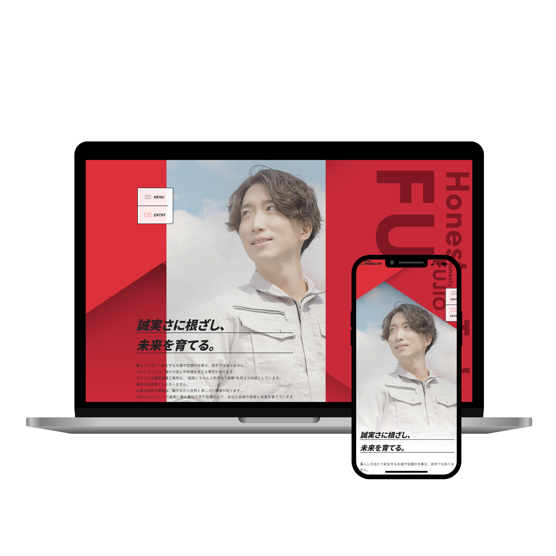 藤尾設備工業所様のリクルートサイトでは、コーポレートサイトとは打って変わり、エネルギッシュな赤をメインカラーに採用。「快適な環境づくりのための工事」の施工という堅実な仕事の中にある「熱量」や「前向きさ」を視覚的に表現しました。